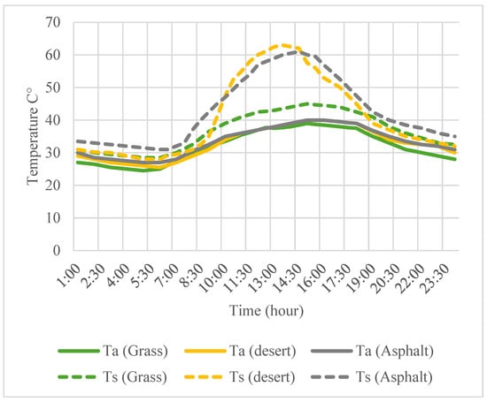 Many UHI articles are based on land surface temperature, which measures the surface urban heat island (SUHI) effect [,,,]. As noted above, SUHI generally reflects CUHI effects but not quantitatively. When exposed to radiation, built-form elements that absorb more energy than vegetated surfaces develop much higher land surface temperatures. Measurements of surface and air temperatures in Phoenix, Arizona (also reported by Mills and Stewart []), show peak land surface temperatures in the desert and over asphalt pavement of around 60 °C in the middle of the day, compared to 45 °C on a suburban irrigated grass surface (ΔTs ≈ 15 °C). (Δ denotes Delta or differential). However, at the same time of day, the near-surface air temperatures of all three surfaces were similar (38–40 °C) (Figure 3).