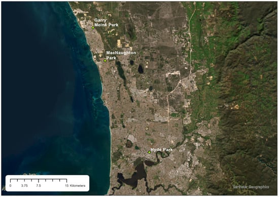 This study examined the likely PCI effects in park case studies (n = 3) in Perth, Western Australia, a city of 2.4 million people stretching some 125 km from north to south on a coastal plain. Perth has a hot-summer Mediterranean climate (Köppen climate classification Csa) and receives moderate, highly seasonal rainfall, predominantly during winter. Summers are generally hot and dry, lasting from December to March, and can cause extreme heat events that pose risks to exposed populations’ health. Research has indicated that Perth has experienced more frequent, longer, and hotter heatwaves in the twenty-first century [].