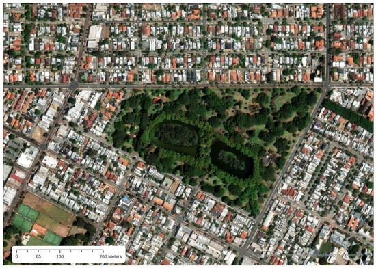 The inner mixed zone of Highgate has a population density of 4008 people per km2 [] and comprises late nineteenth-century inner-city suburbs that fringe the Perth Central Business District. Various housing types include late nineteenth and early twentieth-century workers’ cottages, grand Federation houses and significant apartment developments from the 1960s and 1970s. Tree canopy cover on private lots is generally low due to high building cover, but it is reasonable on the streets. This urban form surrounds Hyde Park, a product of the public parks movement, which saw municipal parks (such as Olmsted’s and Vaux’s design of New York’s Central Park) being established in the mid-nineteenth century in major cities as a way of improving living conditions in overcrowded and quickly growing industrial cities []. Hyde Park reflects such elaborately landscaped parks of the late nineteenth century and comprises walking paths shaded by avenues of trees encircling a central lake (and once a wetland) (Figure 7). The 16 ha park has a canopy cover of 59.5% and a grass cover of 18.7%. Trees are typically exotic and include Platanus acerifolia, Ficus macrophylla, Washingtonia filifera and Jacaranda mimosifolia. Hyde Park is a designated ‘Regional Park’ within the Western Australian classification framework for public open space [].