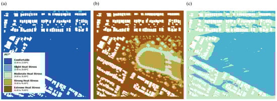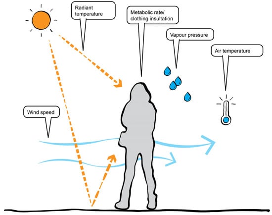 Surface and air temperature maps were generated using the ENVI-met Leonardo programme to compare the microclimatic conditions within parks and their surrounding environment. The human thermal comfort index was calculated using the ENVI-met BioMet programme, a post-processing tool that calculates human thermal comfort indices from ENVI-met output files. PET reflects ‘…the air temperature at which, in a typical indoor setting (without wind and solar radiation), the heat budget of the human body is balanced with the same core and skin temperature as under the complex outdoor conditions to be assessed’ []. The PET index accounts for the combined effect on human physiology arising from air temperature, mean radiant temperature, wind speed, and vapour pressure (i.e., a measure of humidity), depending on clothing and metabolic rate (Figure 8) []. ENVI-met produces calculated values of PET from a refined set of equations derived from Walther and Goestchel [].