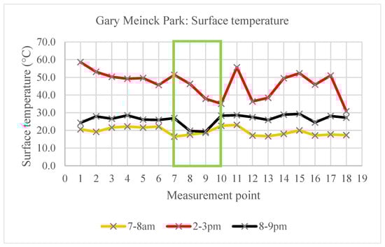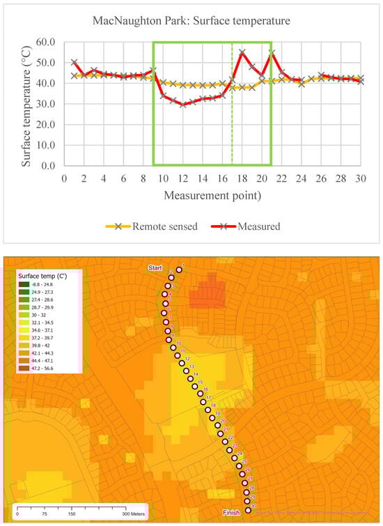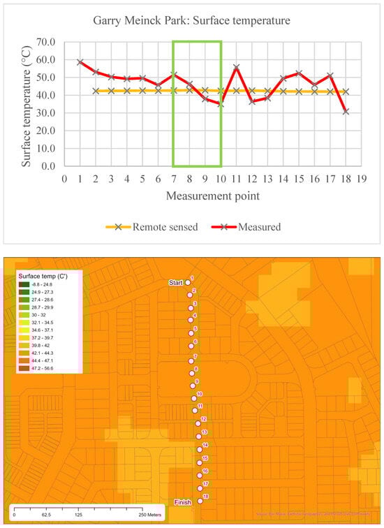 Garry Meinck Park remote-sensed land surface temperature data obtained from Landsat 8 data (see Section 2.2.1) compared to field-measured results taken at the points identified on the plan. A negligible land surface temperature difference is recorded between the park and the urban catchment in the remotely sensed data. Note, the green box on the graphs denotes the park extents.