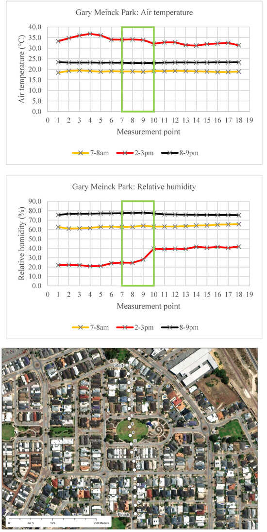 Garry Meinck Park land surface temperature, air temperature and relative humidity obtained from field measurements taken at the points identified on the plan (see Section 2.2.2). The green box on the graphs denotes the park extents. Air temperatures are generally consistent between the park and the urban catchment.