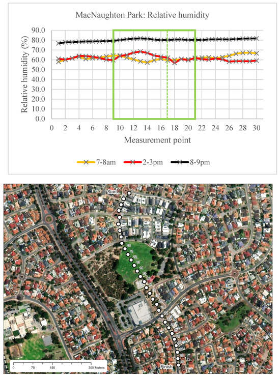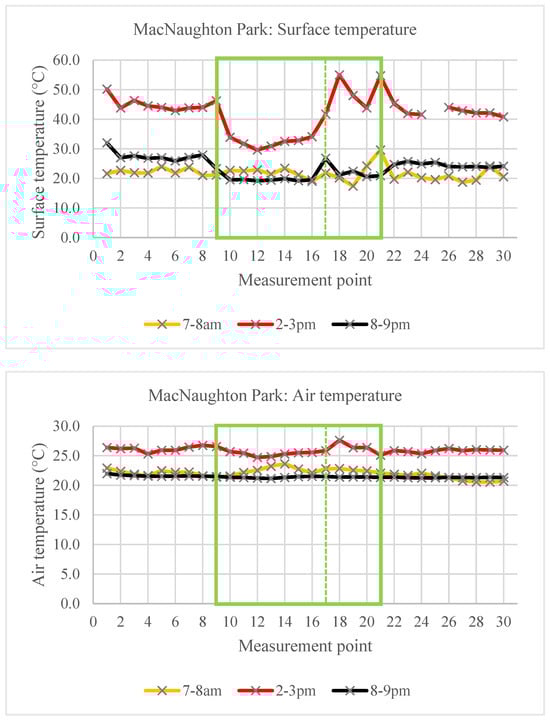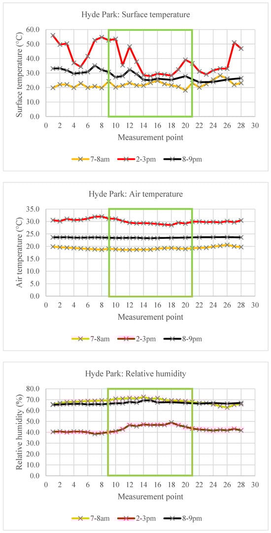 The Hyde Park case study land surface temperature, air temperature, and relative humidity were obtained from field measurements taken at the points identified on the plan (see Section 2.2.2). The park provides the greatest cooling in relation to air temperatures in the afternoon and to a lesser extent in the early morning. Note, the green box on the graphs denotes the park extents.