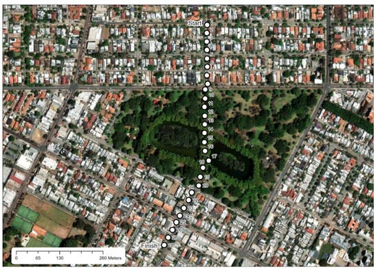 The Macnaughton Park case study land surface temperature, air temperature, and relative humidity were obtained from field measurements taken at the points identified on the plan (see Section 2.2.2). The green box denotes the park extents. The irrigated oval area of the park provides some cooling of air temperatures in the middle of the day, and none in the evening.