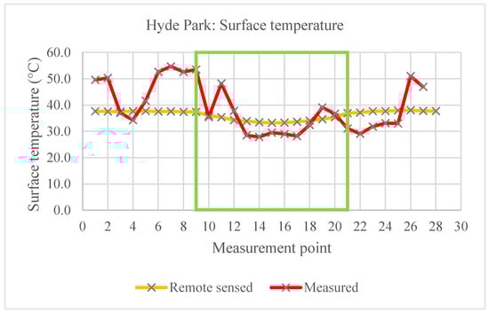 The Hyde Park ENVI-met model shows reasonable agreement between modelled and measured data in respect of both air and surface temperature. Outside the park perimeter, the modelled Ts values (Figure 15) are somewhat lower than the measured data. There is slightly more variance within the park, but this can be attributed to the model surface being grass rather than the actual surface, which is asphalt paving. The ENVI-met and measured Ts results within the park are similar in the afternoon, illustrating the overriding impact of surfaces shaded from direct solar radiation.