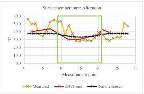 The following figures compare microclimatic data from on-site measurement, remote sensing [], and ENVI-met modelling [].