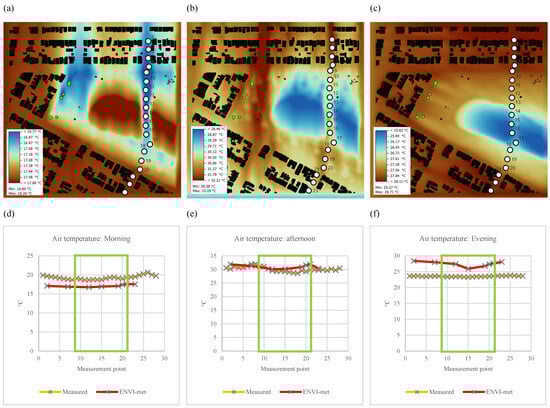 The air temperatures (Ta) (Figure 16d–f) are similar between the datasets. The ENVI-met results are slightly lower in the morning, almost identical in the afternoon and slightly higher in the evening. This situation primarily reflects the macro-scale differences outlined in Table 3.