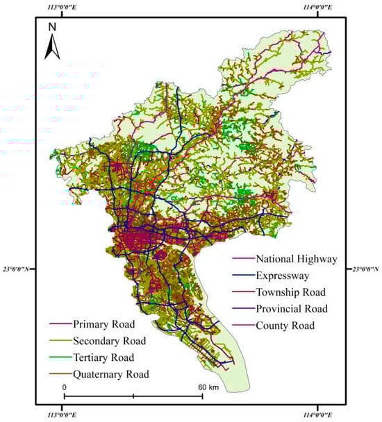 Guangzhou is a major city in southern China, located in the heart of the Pearl River Delta. As the capital of Guangdong Province, it covers approximately 7434 square kilometers with a population exceeding 15 million. Despite rapid urbanization in recent years, significant disparities persist between urban and rural areas in Guangzhou. The differences in infrastructure, logistics services, and economic development levels between Guangzhou’s urban core and surrounding rural regions make it an ideal and representative case for studying logistics accessibility in urban–rural integration [23]. As one of China’s economic hubs, Guangzhou boasts a highly developed logistics industry with comprehensive distribution networks and modern logistics technologies. This context gives Guangzhou high practical value for last-mile logistics research. Particularly, in e-commerce, express delivery, and instant delivery services, Guangzhou leads domestically in logistics innovation and technology application, providing rich field data and research background for this study. Therefore, selecting Guangzhou as the case study helps us to better understand the role of last-mile logistics in urban–rural integration, propose actionable optimization recommendations, and provide reference for other similar cities (Figure 1).