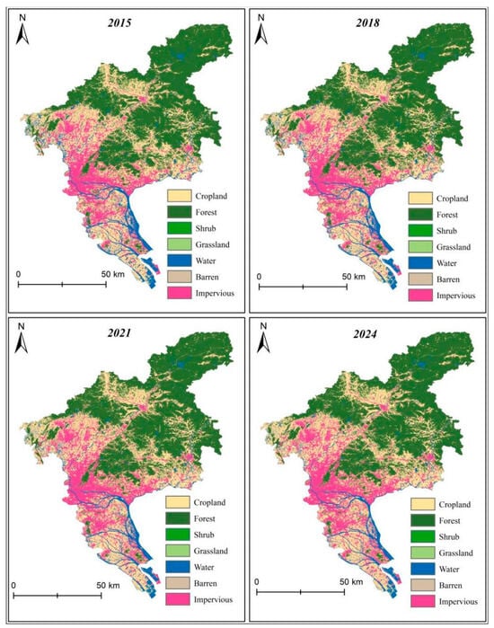 Land use data represents spatial information describing land resource utilization within a region, covering the distribution and changes in different land types. This data helps researchers analyze development levels, land functions, and spatial distribution characteristics of land use across different areas. Land use data typically includes categories such as agricultural land, construction land, forest land, water bodies, and other specially designated land types. Using this data, researchers can identify distinct characteristics of urban and rural spaces, and analyze allocation differences in land resources between them. The land use data in this study comes from Wuhan University’s CLCD (Figure 2) [51].