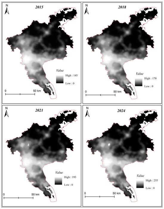 Analysis of spatial distribution maps from 2015, 2018, 2021, and 2024 reveals Guangzhou’s urban space has expanded continuously while rural space has shrunk, showing distinct phased changes and spatial restructuring. Based on urban–rural spatial identification results from 2015 to 2024, we obtain the following key findings: First, regarding spatial scale changes, urban areas show significant expansion, with four-period measurements of 1520.08, 2243.92, 2605.85, and 3040.15 km2, respectively. In sharp contrast, rural areas demonstrate continuous shrinkage during the same periods, measuring 5818.38, 4994.54, 4560.23, and 4198.31 km2. Second, in terms of change rates, statistical analysis reveals the following: urban areas achieve an average annual growth rate of 26.80%, peaking at 47.62%, while rural areas show negative growth with −10.26% average annual rate and −7.94% peak rate (Table 1). Combining these patterns, we draw two major conclusions: On one hand, Guangzhou’s urban expansion contrasts sharply with rural contraction, clearly reflecting ongoing urbanization; on the other hand, the urban growth rate initially accelerates then gradually decelerates.