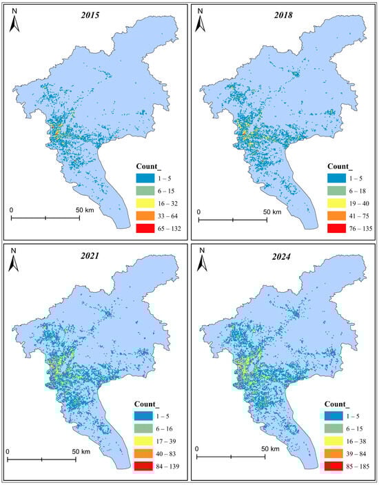 The four-period comparison clearly demonstrates urban space progressively extending outward with expanding boundaries. In 2015, urban areas concentrated mainly in central and southern Guangzhou. By 2018, urban space expanded significantly with broader distribution and more complex boundaries. Starting in 2021, urban growth showed both area expansion and merging between fringe zones. By 2024, urban space became more continuous and networked, with clearer core-subcenter-periphery structures. The urban spatial expansion shows nonlinear characteristics, demonstrating a “rapid-slow-stable” phased pattern. From 2015 to 2018, urban expansion reached its peak with the largest quantity and area of new urban spaces. Multiple urban fringe areas developed rapidly, including Nansha New District, Panyu, and Huangpu Technology City. From 2018 to 2021, the expansion pace slowed significantly, with existing urban patches beginning to connect and form more complete structural units. Urban development shifted from outward expansion to internal optimization. From 2021 to 2024, urban boundary expansion further decelerated, mainly featuring local edge adjustments, while the spatial pattern evolved from “fragmented-multicore” to “contiguous-network” (Figure 5).