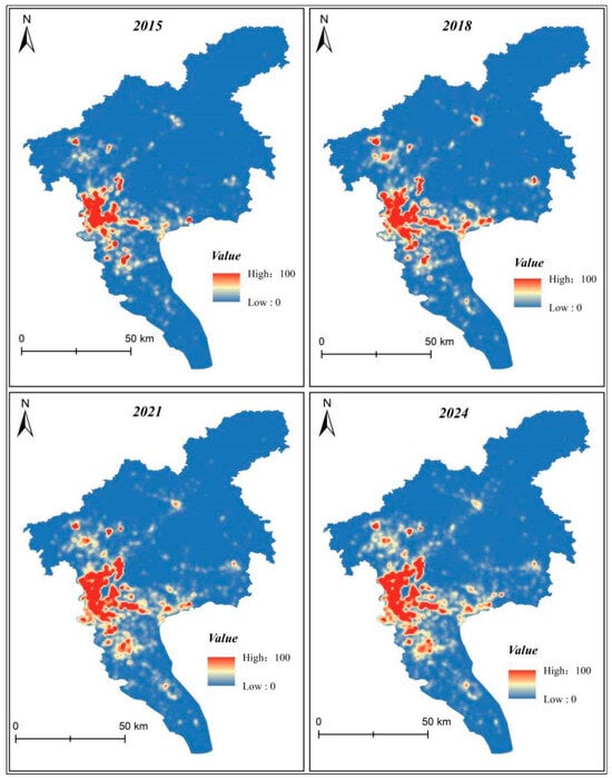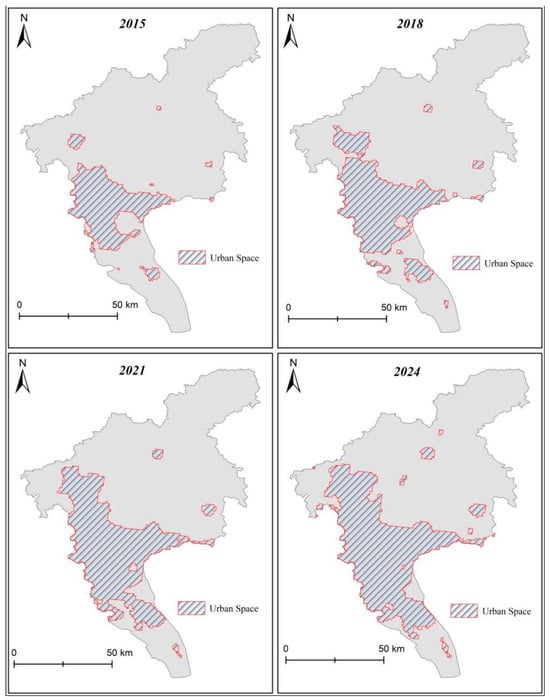In summary, from 2015 to 2024, Guangzhou’s urban–rural space underwent significant transformation from concentrated to expanded patterns, with clear boundaries becoming increasingly blurred. The urban space continuously expanded outward and growing in scale, particularly from 2015 to 2018 when expansion reached its fastest pace. Meanwhile, rural space gradually decreased and became more marginalized. These changes collectively reflect accelerated spatial restructuring dominated by urban expansion and the progressing trend of urban–rural integration.