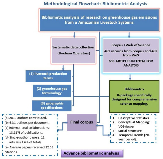 This study employed a bibliometric approach to analyze research trends in greenhouse gas emissions from Amazonian livestock systems. The methodology encompassed systematic data collection, rigorous screening processes, and advanced bibliometric analysis techniques. Bibliometric approach was chosen because it offers several advantages that make it particularly suited to addressing the research gap. It provides an objective, reproducible, and scalable method to [69]: