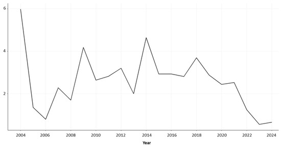 The agricultural sector’s trajectory, represented by Agricultural Systems, shows steady but moderate growth, suggesting either a maturing field or untapped opportunities. This contrasts with the consistent upward trend in land use policy, which underscores the foundational importance of governance in environmental management [76,77,78,79,80,81].