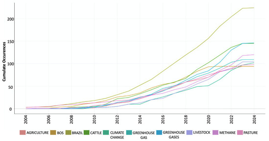 The temporal evolution of keyword frequency in scientific literature reveals significant trends in environmental and agricultural research, highlighting a growing global interest in climate change and the increasing prominence of Brazil as a key research context (Figure 4).