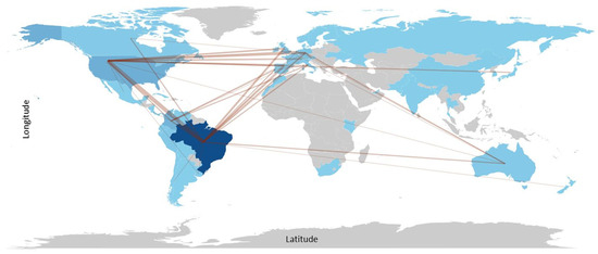 The climate-land use cluster (blue) radiates from its Brazilian epicenter. The term “Brazil” is centrally positioned, serving as a geographic anchor for 62% of land use studies, the primary context for deforestation research, and the most frequent bridge between biophysical and policy studies.