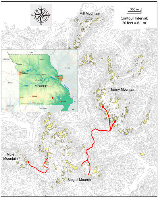 A topographical map of the mountains colonized by collared lizards. The red rectangle in the inset map of the State of Missouri on the left side indicates the location of the detailed area in the remainder of the figure. The lizards were translocated onto Stegall Mountain and remained there until colonization of the other mountains on this map occurred after prescribed burning of the forested areas between the mountains. Red arrows indicate the paths of least resistance between lizards captured as hatchlings on Stegall Mountain to their recapture points as yearlings on Mule and Thorny Mountains.