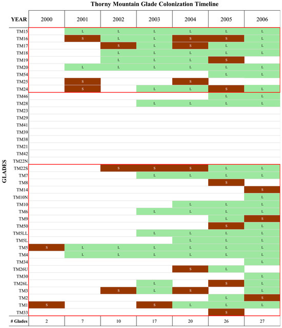 Glade colonization of Thorny Mountain over time. The glades are roughly ordered north-west to south-east in going from the top to the bottom of this figure. The glades under burn management during the study period are enclosed by red boxes. Glades smaller than the smallest glade colonized are not shown. Brown with the letter S indicates collared lizard scat was found on the glade, and green with the letter L indicates that lizards were found on the glade. The total number of glades with scat or lizards per year is indicated at the bottom in the row labelled “# Glades”.