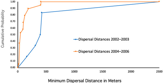 The cumulative frequency distributions of the minimum dispersal distance (straight-line dispersal) observed during the colonization of Thorny Mountain during the early phase of colonization (2002–2003) and the later phase of colonization (2004–2006).
