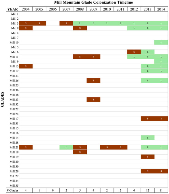 Glade colonization of Mill Mountain over time. The glades are roughly ordered from south-west to north-east in going from the top to the bottom of this figure. Brown with the letter S indicates collared lizard scat was found on the glade, and green with the letter L indicates that lizards were found on the glade. The total number of glades with scat or lizards per year is indicated at the bottom in the row labelled “# Glades”. Only one visit was made in 2014, so that this year is under-sampled relative to the other years.