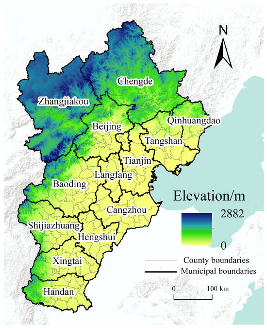 The Beijing-Tianjin-Hebei region is located in the northern part of the North China Plain (113°27′–119°50′ E, 36°05′–42°40′ N). As shown in Figure 1, its administrative divisions include Beijing Municipality, Tianjin Municipality, and Hebei Province, which comprises 11 prefecture-level cities: Shijiazhuang, Hengshui, Xingtai, Handan, Baoding, Langfang, Cangzhou, Zhangjiakou, Chengde, Qinhuangdao, and Tangshan. In 2024, the GDP of the Beijing-Tianjin-Hebei region was estimated at CNY 11.5 trillion. This accounts for approximately 8.53% of the national total and positions the region as a critical economic growth pole in China. Transformations among land use types during land use processes not only influence carbon emission levels but also alter the ESV. Due to its complex land use structure, rapid urbanization, and high energy consumption, the Beijing-Tianjin-Hebei region has become a major contributor to carbon emissions in China. It is estimated to contribute approximately 11% of national carbon emissions, with a carbon emission intensity approximately 40% higher than the national average. The region also possesses abundant ecosystem resources and has been designated as a demonstration zone for ecological restoration and environmental enhancement in China. However, substantial challenges remain in advancing these efforts.