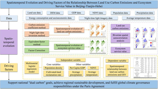 Therefore, this study selects the Beijing-Tianjin-Hebei region as a case study. By taking county-level administrative units as the analytical scale, it investigates the spatiotemporal relationships and inherent driving factors between land use carbon emissions and ESV. The findings are expected to provide scientific evidence for coordinated regional emission reduction and land use spatial planning. Moreover, the findings have broader relevance beyond the case region. The identified development challenges and transformation pathways are typical of other urban agglomerations in China and similar regions globally. The conclusions offer both theoretical insights and practical guidance for other regions in China and developing countries facing similar pressures.