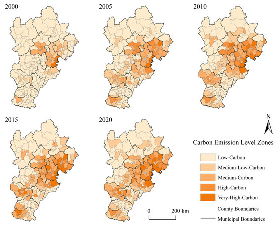To facilitate visual interpretation, land use carbon emissions in the Beijing-Tianjin-Hebei region were classified into five tiers using the natural breaks method, based on existing studies and regional characteristics [63,64]: low-emission areas (<0.5 million tons), medium-low-emission areas (0.5–0.8 million tons), medium-emission areas (0.8–1.5 million tons), high-emission areas (1.5–2.2 million tons), and ultra-high-emission areas (2.2–5.5 million tons), as shown in Figure 3.