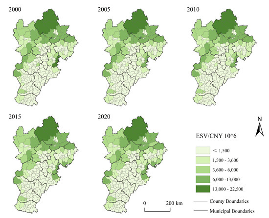 Spatiotemporal patterns of ESV at the county scale in Beijing-Tianjin-Hebei.