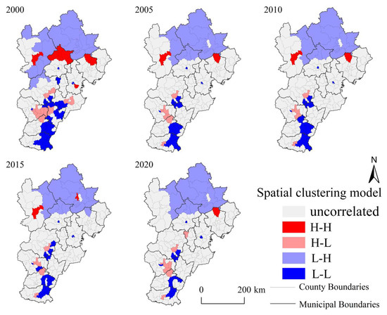As shown in Table 9, Global Moran’s I values remained consistently negative, with p-values below 0.05. This indicates a statistically significant negative spatial correlation between land use carbon emissions and ESV in the Beijing-Tianjin-Hebei Region. Specifically, increases in land use carbon emissions were associated with decreases in ESV. Furthermore, from 2000 to 2020, Global Moran’s I exhibited an overall increasing trend. This indicates a transition from spatial clustering to spatial dispersion in the relationship between carbon emissions and ESV. This trend suggests enhanced spatial coordination between regional ecological protection and carbon management strategies.