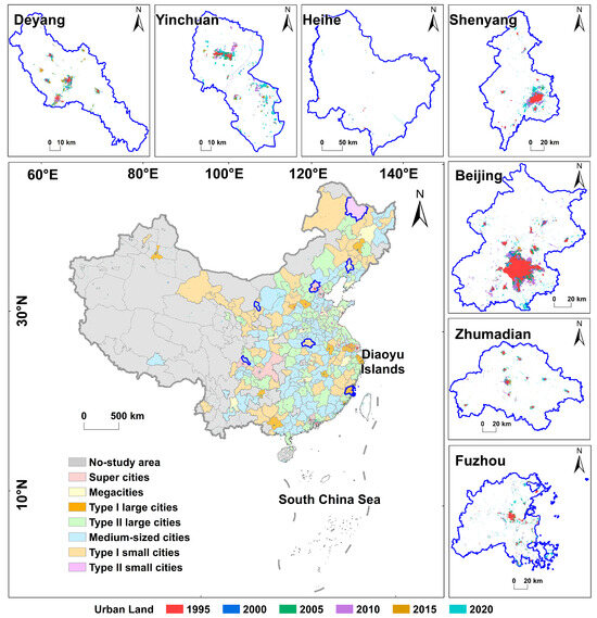 Geographical location of the study area and urban land expansion process from 1995 to 2020 (supercity: Beijing; megacity: Shenyang; type I large city: Fuzhou; type II large city: Yinchuan; medium-sized city: Deyang; type I small city: Zhumadian; and type II small city: Heihe).