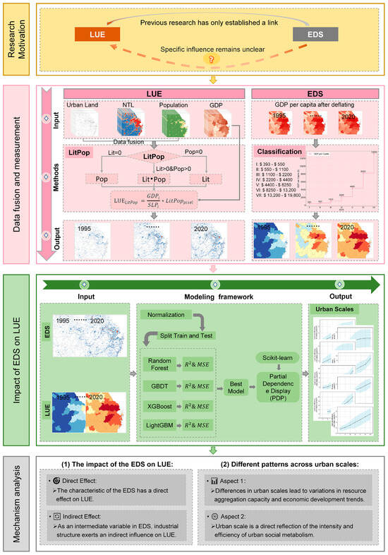 Modeling framework of this study (research motivation, data fusion and measurement, impact of EDSs on LUE, and mechanism analysis).