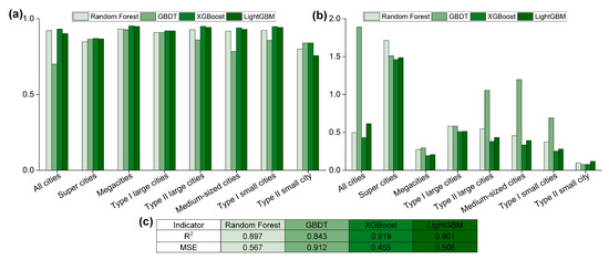 R2 and MSE of random forest, GBDT, XGBoost, and LightGBM: (a) R2 for different urban scales, (b) MSE for different urban scales, and (c) average R2 and MSE.