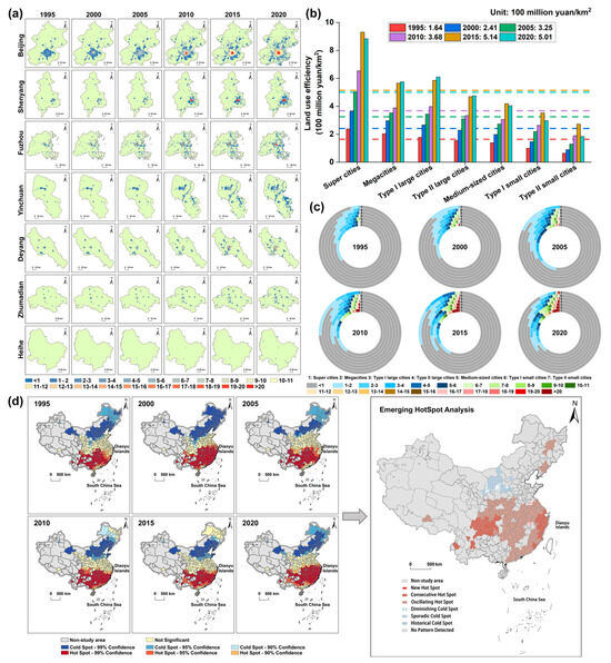 Temporal evolution trends and spatial heterogeneity in LUE: China’s LUE has increased annually, with the average value rising from 164 million CNY/km2 in 1995 to 501 million CNY/km2 in 2020, representing an average annual increase of 13 million CNY/km2. The spatial heterogeneity of LUE is primarily evident in three key aspects. First, based on the spatial heterogeneity of LUE within the city, regardless of the urban scale, the LUE is highest in the city center and gradually diminishes toward the peripheral areas (Figure 4a), a trend that aligns with the process of urban land expansion. Second, there were noticeable differences in LUE across various urban scales (Figure 4b). In 1995, the LUE decreased in the order of the urban scale. However, as the economy gradually developed, the LUE in different urban scales increased to varying extents. By 2020, the ranking of LUE was, in descending order, as follows: supercities, type I large cities, megacities, type II large cities, medium-sized cities, type I small cities, and type II small cities. Regarding the proportion of LUE at different urban scales (Figure 4c), the proportion of higher LUE increased annually. By 2020, with the continuous expansion of the urban scale, the proportion of LUE of less than 100 million CNY/km2 gradually decreased, while the proportion of LUE greater than 2 billion CNY/km2 steadily increased. Finally, the Getis–Ord Gi statistic was used to identify specific clusters of high and low LUE. Chinese cities exhibit a three-segmented distribution: predominantly cold spots in the north, not significant in the center, and predominantly hotspots in the south (Figure 4d). Emerging hotspot analysis was used to effectively capture the clustering trends of LUE across time and space. Regarding hotspots, oscillating hotspots were primarily concentrated in Central and Southern China, as well as in some cities in Northeast China, while consecutive hotspots were mainly concentrated in the Yangtze River Delta urban agglomeration and Chengdu–Chongqing urban agglomeration, which are closely related to the high level of economic development and national policy support caused by the industrial agglomeration effect. The rapid development of the Chengdu–Chongqing urban agglomeration is also consistent with current national policy-guided strategic planning [55,56]. Cold spots include diminishing, sporadic, and historical cold spots, which are mainly located in the northwest regions, such as Shanxi Province, the Ningxia Hui Autonomous Region, and the Inner Mongolia Autonomous Region.