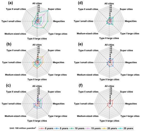 Land maturation and efficiency enhancement process: The term “age” is introduced to reveal the land maturation and efficiency enhancement process and is defined as the difference between 2020 and the year in which urban land is generated. As urban land ages, the continuous improvement in LUE reflects the process of land maturation and efficiency enhancement. This concept is essentially different from the general term “land development” and emphasizes the dynamic evolution of functional optimization and efficiency accumulation during the use of urban land. Figure 5a–f compare the differences in land maturation and efficiency enhancement processes across various urban scales at different ages. From the perspective of the differently colored polygons, it is clear that, as urban land matures, LUE gradually increases, confirming the land maturation and efficiency enhancement processes. Using urban land in 1995 as an example, the LUE of all cities increased from 164 million CNY/km2 at age 0 to 826 million CNY/km2 at age 25. However, the LUE at different ages does not always follow a pattern whereby older land consistently shows higher LUE. For example, megacities have lower LUE at age 25 (1.08 billion CNY/km2) than at age 20 (1.11 billion CNY/km2). The land maturation and efficiency enhancement process provides a theoretical foundation for subsequent research on the impact of EDSs on LUE.