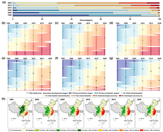 Division of the EDSs: (a) the percentages of the EDSs in different years; (b–g) show the transition processes of the EDSs in different urban scales and (h) shows the identification of hot and cold spots in the EDSs from 1995 to 2020.