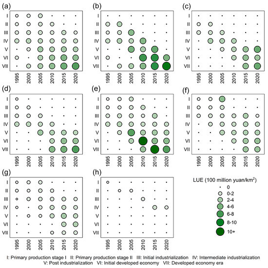 Figure 7 shows a bubble heat map that depicts the various characteristics of LUE in different EDSs. The LUE increased as the bubble was enlarged and the color darkened and vice versa. For all cities (Figure 7a), from a vertical perspective, taking 2010 as an example, the LUE increased from 233 million CNY/km2 in primary production stage II to 582 million CNY/km2 in the developed economy era, indicating that, as the EDS advanced, the LUE increased. From a horizontal perspective, taking the developed economy era as an example, the LUE increased from 290 million CNY/km2 in 2000 to 870 million CNY/km2 in 2020, indicating that the later the EDS, the higher the LUE. Different urban scales also followed the same patterns, with varying growth speeds and magnitudes (Figure 7b–h). As the EDS advances, the LUE of supercities and type II large cities increases at a faster rate and that of megacities and type I large cities increases at a moderate rate. In contrast, the LUE of medium-sized cities and small cities increases relatively slowly, which may be closely linked to factors such as the urbanization level, land use structure, industrial structure, and policy support [30,57,58].
