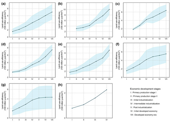 The characteristics of different EDSs have a significant impact on LUE. Specifically, primary production stage I was dominated by agriculture, during which urban land was used more often for residential purposes and the LUE was the lowest. In primary production stage II, the proportion of the primary industry remained large, and the proportion of the secondary industry began to rise. During this phase, part of the urban land was used for industrial purposes, but the overall level of LUE remained low. In the initial industrialization stage, the traditional structure dominated by agriculture gradually shifted to an industrialized structure dominated by modern industry. With the rapid rise and dominance of the secondary industry, the LUE increased, although it was still limited by factors such as the technological level and workforce quality. In the stage of intermediate industrialization, the secondary industry continued to dominate, while the proportion of tertiary industries began to rise rapidly. With technological advancements and the optimization and upgrading of the industrial structure, the functions of urban land became more diversified, leading to further improvements in LUE. In post-industrialization, the tertiary industry began to shift from steady to rapid growth and gradually became the main force for regional economic growth. During this stage, the use of urban land tended to be more commercial, and the LUE improved considerably. When the EDS entered the initial developed economy and developed economy eras, the tertiary industry continued to dominate. With the deepening development of urbanization and industrialization, the structure and function of urban land become more rational. At the same time, relevant urban departments enhanced the protection and management of land resources, leading to higher and more stable LUE.