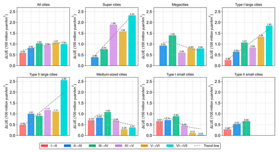 Figure 9 demonstrates that the growth in LUE at different urban scales progressed from one EDS to the next. For all cities, when the economic development stage transitioned from stage I to II, stage II to III, stage III to IV, stage IV to V, stage V to VI, and stage VI to VII, the LUE increased by 59 million CNY/km2, 82 million CNY/km2, 104 million CNY/km2, 94 million CNY/km2, 107 million CNY/km2, and 100 million CNY/km2, respectively. This confirms the trend whereby the later the EDS, the greater the impact on LUE. The impact of LUE evolution from one EDS to the next varied across different urban scales. According to the average growth in LUE, supercities, megacities, type I large cities, type II large cities, medium-sized cities, type I small cities, and type II small cities exhibited values of 139 million CNY/km2, 91 million CNY/km2, 100 million CNY/km2, 121 million CNY/km2, 66 million CNY/km2, 48 million CNY/km2, and 49 million CNY/km2 respectively. Combined with the growth trend in the impact of the EDS on LUE between 1995 and 2020, with the evolution of the EDS, the growth rate of LUE in supercities, type I large cities, type II large cities, and type II small cities gradually increased. This indicates that the later the EDSs of these cities, the greater the impact on LUE. With the advancement of the EDS, the growth rate of the LUE for megacities, medium-sized cities, and type I small cities was the highest during the transition from initial to intermediate industrialization, at 140 million CNY/km2, 109 million CNY/km2, and 89 million CNY/km2, respectively. This implies that the impact of the EDSs of these cities on LUE follows an inverted U-shaped pattern, with the LUE growing faster at larger urban scales.