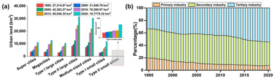 China’s urbanization process is characterized by a rapid pace of development, large-scale expansion [59], and significant changes in land use patterns. These characteristics provide typical cases and valuable insights into global urbanization. The expansion of urban land is not only an important feature of the urbanization process but also a major indicator of its progress. The amount of urban land in Chinese cities has been steadily increasing year by year, from 27,314.87 km2 in 1995 to 107,779.32 km2 in 2020, with an average annual increase of 3218.58 km2 (Figure 10a). There is a disparity in urban land areas of different urban scales. By 2020, the urban land area, in descending order, was distributed as follows: type II large cities, medium-sized cities, megacities, type I small cities, supercities, type I large cities, and type II small cities. While experiencing rapid urbanization, China has also experienced a rapid transformation in its industrial structure. China’s transformation from an agriculture-based economic structure to one dominated by industry, manufacturing, and services has resulted in geospatial imbalances and distinct patterns of economic development across different regions and urban scales. As shown in Figure 10b, China’s industrial structure has transformed from 19.6%, 46.7%, and 33.7% in 1995 to 7.7%, 37.8%, and 54.5% in 2020, respectively. During this period, the proportions of primary and secondary industries gradually decreased, whereas the proportion of tertiary industries continued to increase. On the one hand, this indicates that the tertiary industry has become the main driving force behind China’s economic growth. On the other hand, it reflects the fact that the rationalization and upgrading of the industrial structure are constantly improving, signaling that the transformation of China’s economic structure has reached a critical stage. In summary, against the background of uneven development in China’s urban geographical space, this study aims to offer a scientific basis for urban land use planning and policy formulation.