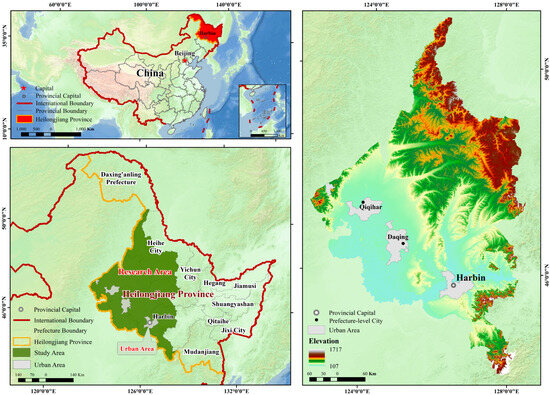| Tianditu Platform (https://www.tianditu.gov.cn/, accessed on 13 July 2025) | Administrative vector data for 35 counties/districts in Heilongjiang’s Agro-Pastoral Zone | Spatial analysis and planning applications |