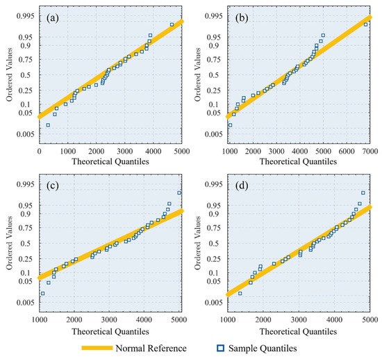 - Filliben, J.J. The Probability Plot Correlation Coefficient Test for Normality. Technometrics 1975, 17, 111–117. [Google Scholar] [CrossRef]