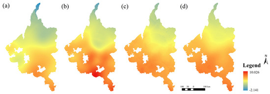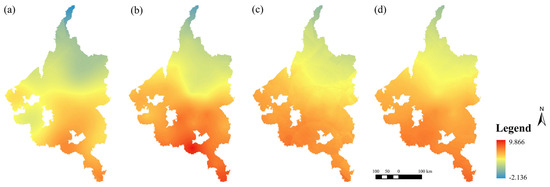 - Among the tested configurations, Ordinary Kriging using an exponential kernel and semivariogram with a step length of 13 produced the most accurate interpolation results (RMSE = 0.856), with minimal mean error and balanced standardized error metrics. In contrast, Co-Kriging, which integrated several factors, showed slightly inferior performance (RMSE = 0.891). The results from Geographically Weighted Regression (GWR) were also largely consistent with those of the optimal Ordinary Kriging model.