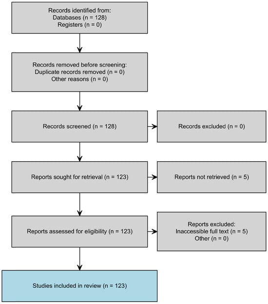 PRISMA 2020 flow diagram for systematic literature review. Flowchart showing the systematic identification, screening, and selection process for coastal landscape intervention studies. The search of the Scopus database yielded 128 initial records, with 5 records being excluded due to inaccessibility of the full text. No additional exclusions were made based on inclusion criteria, resulting in 123 studies being included in the final meta-synthesis. The diagram follows PRISMA 2020 guidelines for the transparent reporting of systematic review methodology.
