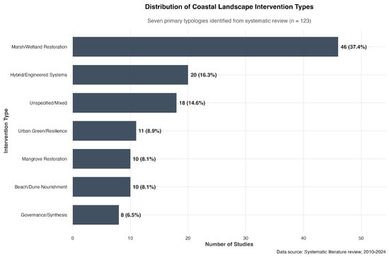 The seven intervention typologies identified in this meta-synthesis reveal how coastal adaptation is evolving from singular ecological restoration efforts to more complex, hybridized, and multifunctional design strategies. The continued dominance of Marsh/Wetland Restoration (37.4%) confirms the practical reliability and ecological familiarity of these interventions—“low-regret” solutions that offer both risk reduction and habitat benefits with established implementation pathways. The underrepresentation of Urban Green/Resilience strategies (8.9%) reflects an evidence gap rather than a lack of relevance. Multifunctional urban coastal spaces are likely documented in municipal reports and design briefs that fall outside the academic literature, suggesting a priority area for research translation and the systematic documentation of urban implementation outcomes.