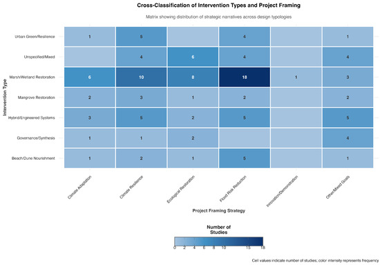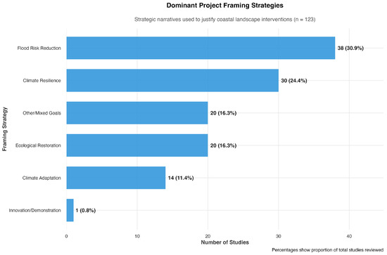 While Flood Risk Reduction (30.9%) remains the dominant narrative, the rise in Climate Resilience (24.4%) and Ecological Restoration (16.3%) reflects growing institutional alignment with long-term adaptation thinking. The lack of significant association between intervention types and framing strategies (, ) reveals strategic opportunities for improved institutional alignment, where hybrid systems could leverage restoration narratives to access ecological funding streams while maintaining their resilience focus.