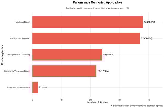 Inter-rater reliability was assessed through the independent re-coding of a random sample of 12 studies (9.8%) using standardized operational definitions consistent with all systematic classifications. Cohen’s Kappa analysis demonstrated acceptable-to-substantial agreement across core variables—intervention typology (, moderate agreement), project framing (, substantial agreement), monitoring approaches (, moderate agreement), and SLR integration (, almost-perfect agreement). Mean reliability across available variables was , confirming the consistent application of systematic classification criteria matching those used throughout the analysis.