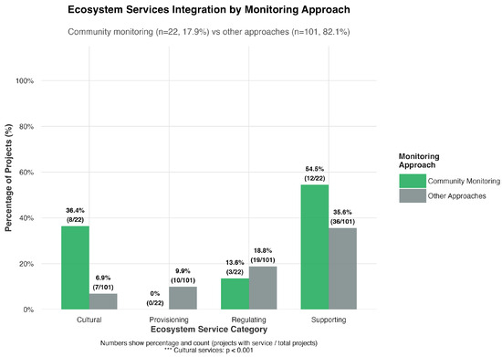 Community Monitoring as an Integration Catalyst: Community monitoring projects demonstrate significantly higher ecosystem services integration across multiple categories, particularly cultural services (36.4% vs. 6.9%, ), reflecting emphasis on recreational amenities, esthetic values, and public space creation. The complete absence of provisioning services in community monitoring projects (0% vs. 9.9% for other approaches) indicates the prioritization of non-extractive, public benefit outcomes over commercial resource utilization.