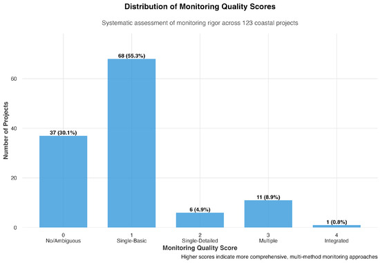 Despite no studies omitting monitoring entirely, fundamental limitations constrain the field’s capacity for evidence-based advancement. The monitoring quality assessment revealed a mean score of 0.89 out of 5.0, with 30.1% offering only ambiguous monitoring (), 55.3% using basic single methods (), and zero projects achieving comprehensive adaptive monitoring standards. Higher quality monitoring correlated significantly with explicit SLR integration (, ), establishing monitoring rigor as a predictor of climate-informed design practice, while highlighting disconnects between evaluation capacity and measurable outcomes.
