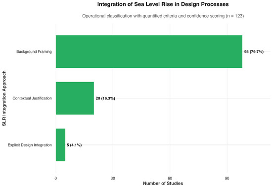 Sea Level Rise Integration Reveals Science–Practice Disconnect: The operational classification revealed minimal explicit SLR integration, with only five studies (4.1%) demonstrating both climate scenario references and quantitative design parameters. While 95.9% of projects acknowledge SLR, the majority (79.7%) provided only background framing without meaningful connection to design specifications. No projects used standardized IPCC scenario frameworks (0 projects used RCP scenarios and 0 used SSP scenarios), though 5 projects included quantitative SLR values. This science–practice gap reveals that while climate awareness is widespread, translating this awareness into operational design parameters remains a fundamental challenge.