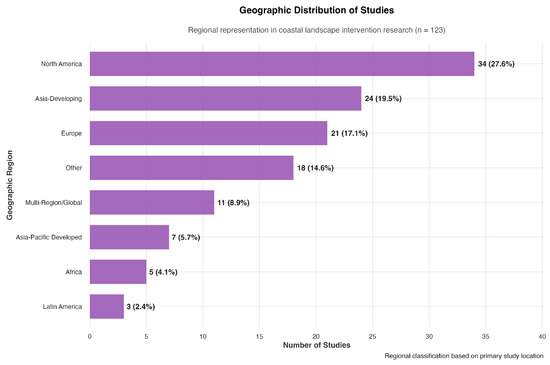 A total of 123 studies were included in the final analysis, spanning diverse geographic contexts, intervention types, and disciplinary perspectives. The reviewed studies ranged from singular case studies to comprehensive syntheses of multiple implemented interventions. Publication dates were concentrated between 2015 and 2024, with 89% of studies being published during this period, reflecting accelerating attention to nature-based and landscape-scale coastal adaptation strategies (Table 2).